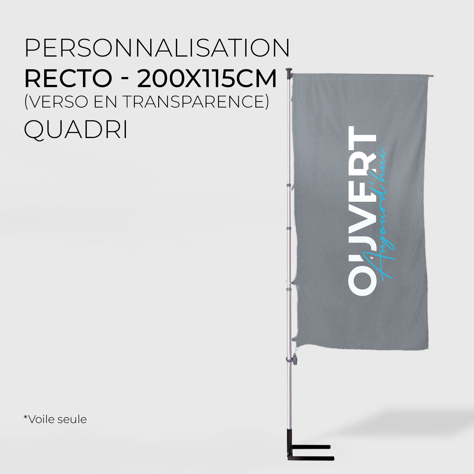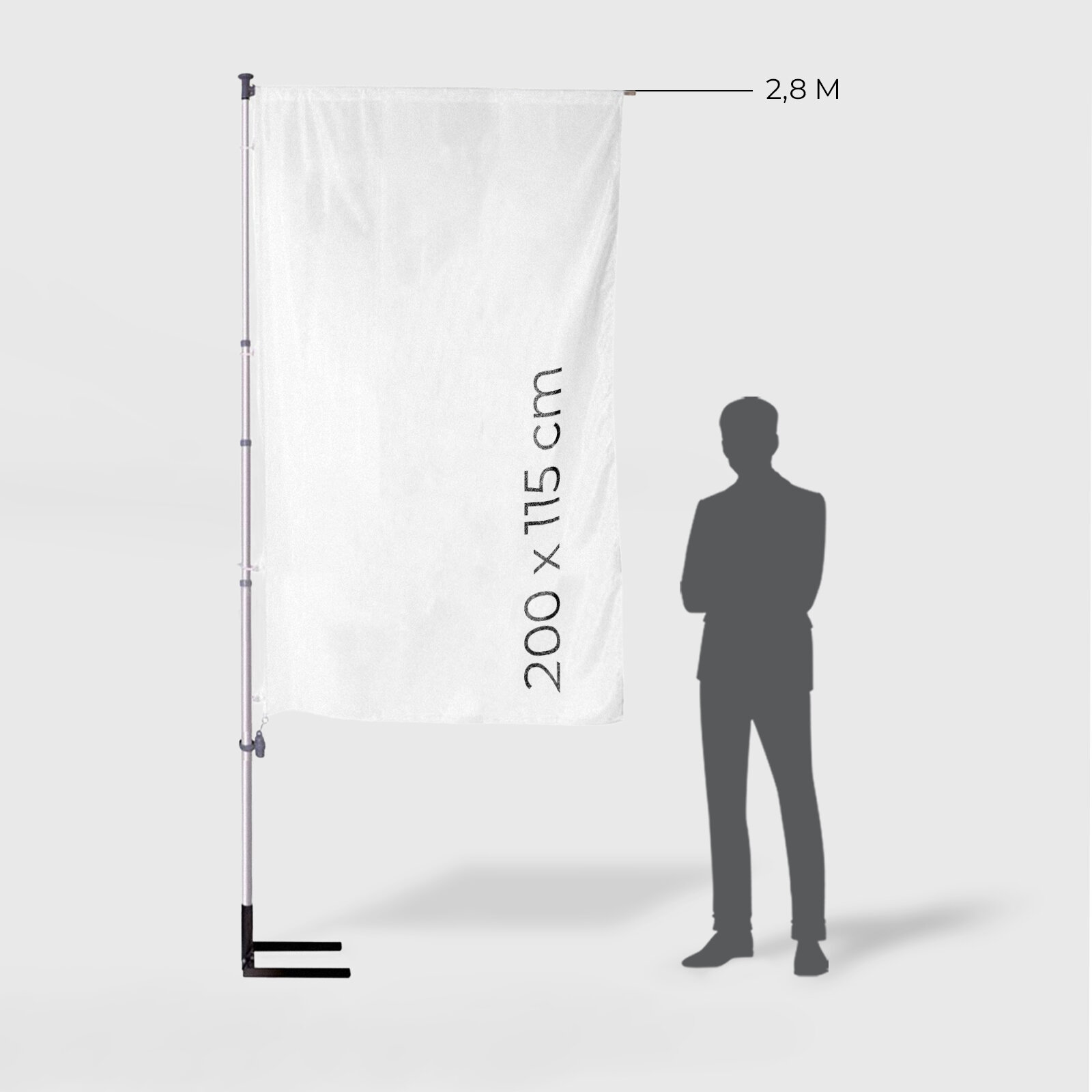 Ce pavillon publicitaire personnalisé vertical est spécialement fabriqué pour se fixer aux mâts à potence. Équipé d'un fourreau haut, le drapeau vertical se glisse sur la potence lui garantissant une tension permanente et donc une visibilité constante de grande qualité, même sans vent.