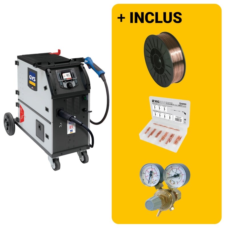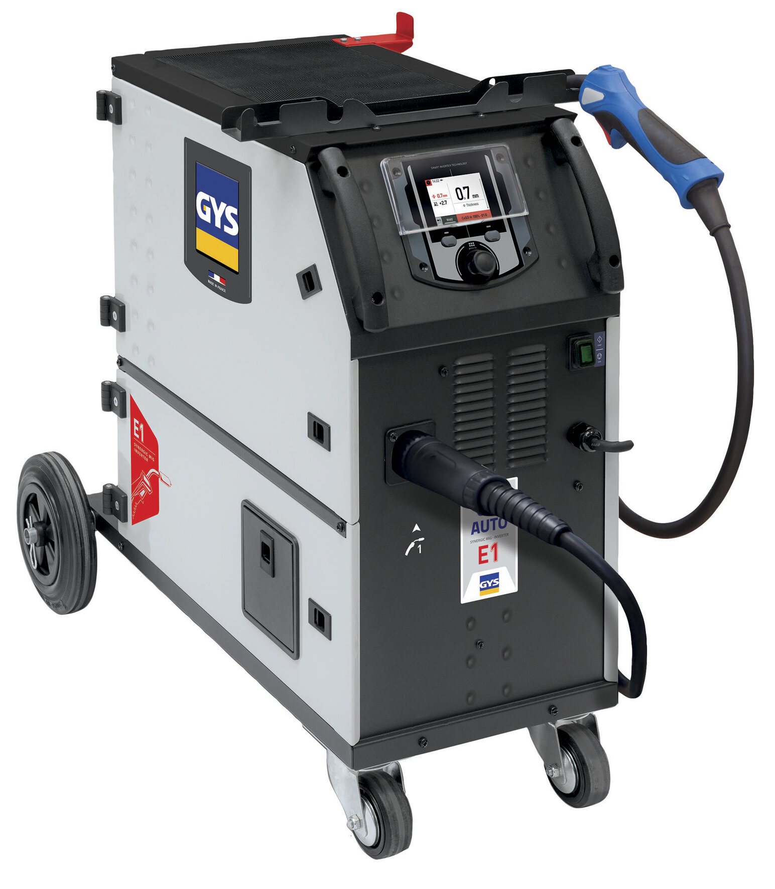 - E1 GYS AUTO est un poste à souder MIG/MAG monophasé synergique de 200 A, spécialement conçu pour le carrossier
