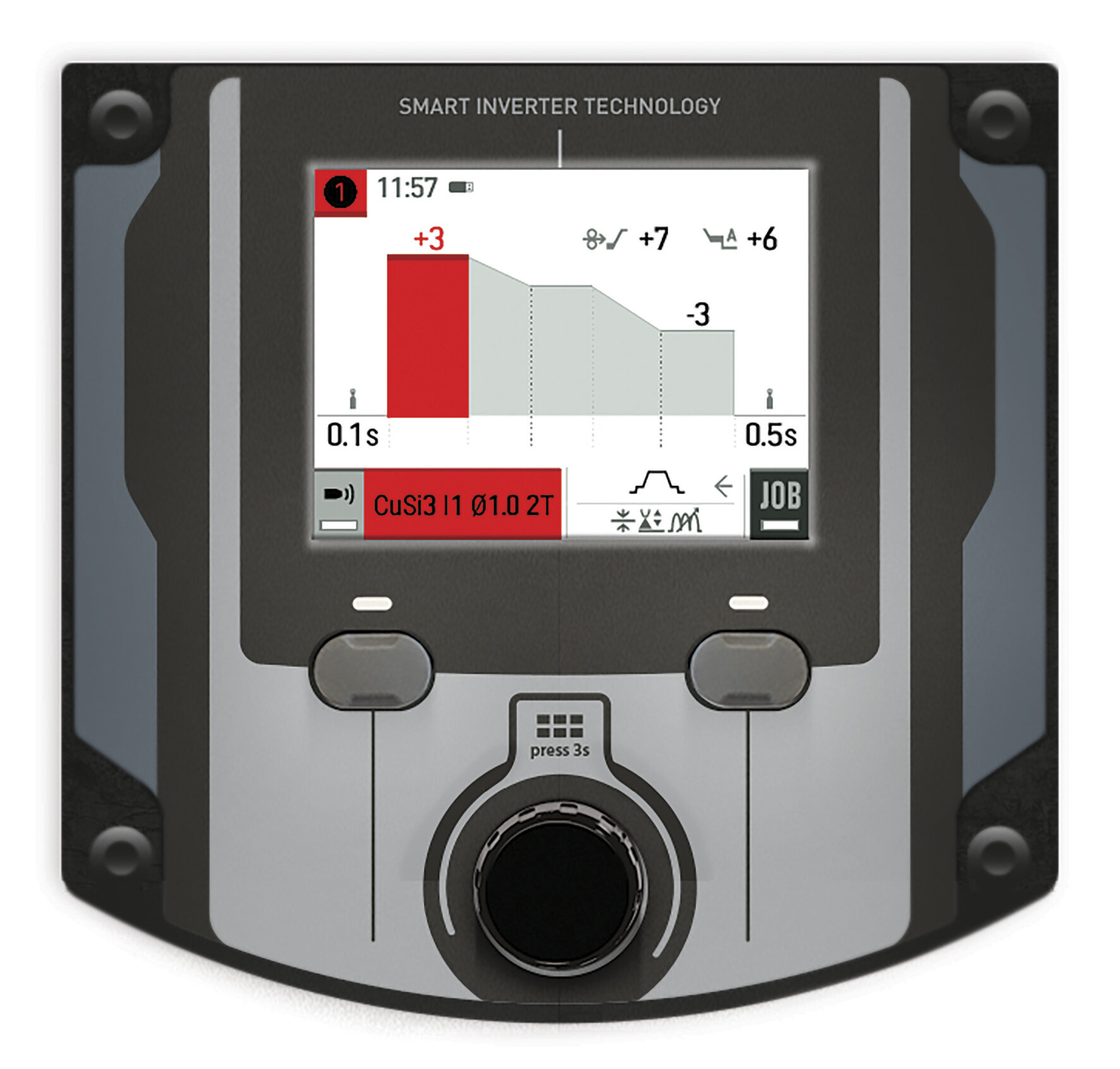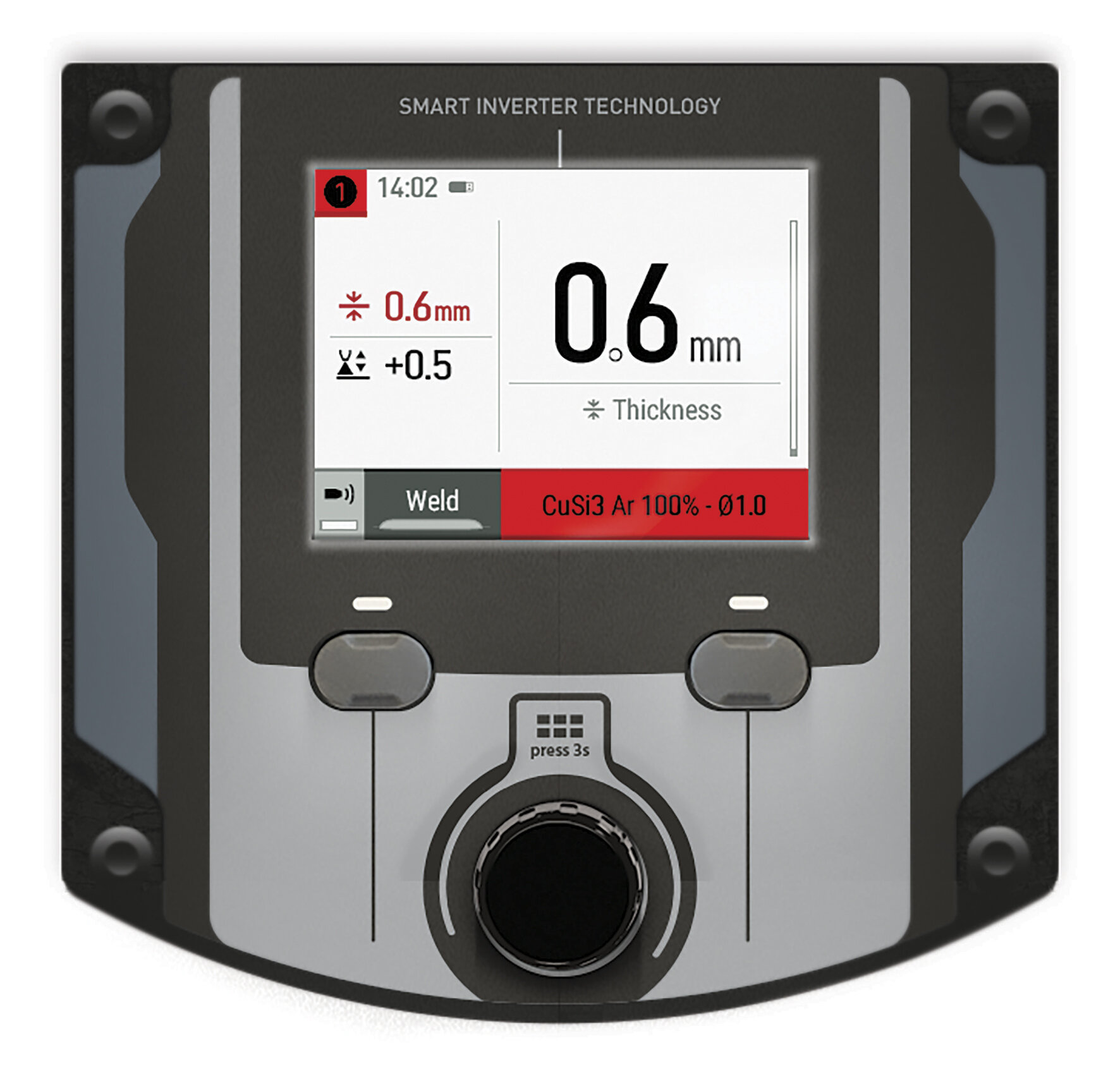- 4 réglages: Matière à souder (synergies), diamètre du fil, épaisseur et longueur d’arc.