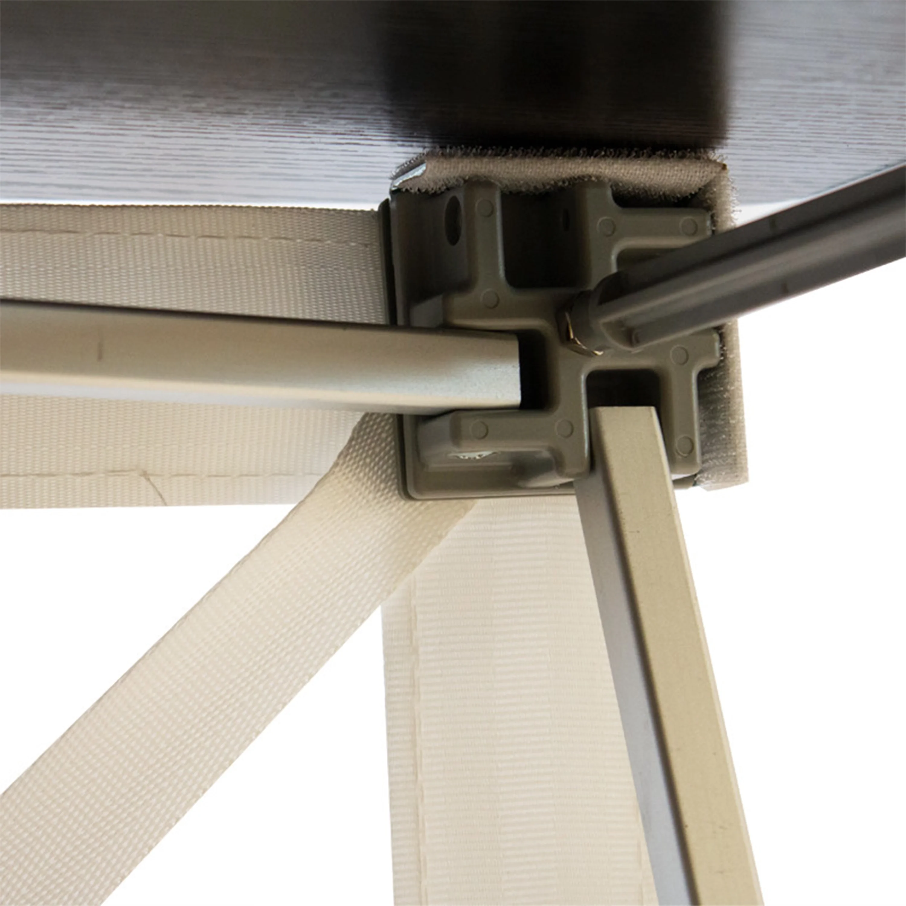 Montage et démontage très simple (2-3 minutes) de la structure type parapluie et de la toile décors fixée par velcro.