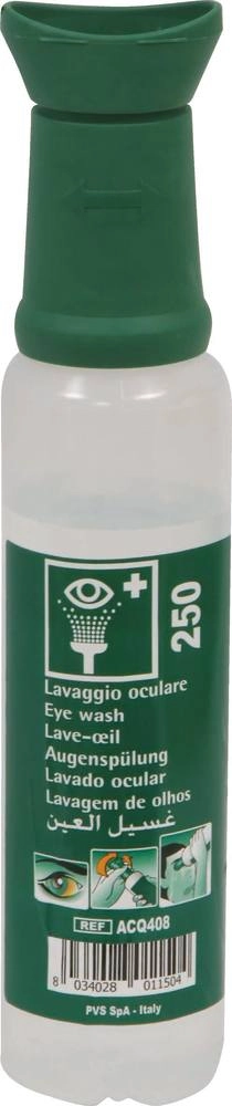 - Flacon lave oeil de 250ml de sérum physiologique stérile permettant un rinçage oculaire immédiat et abondant lors de projections de particules solides (poussière, sciure)