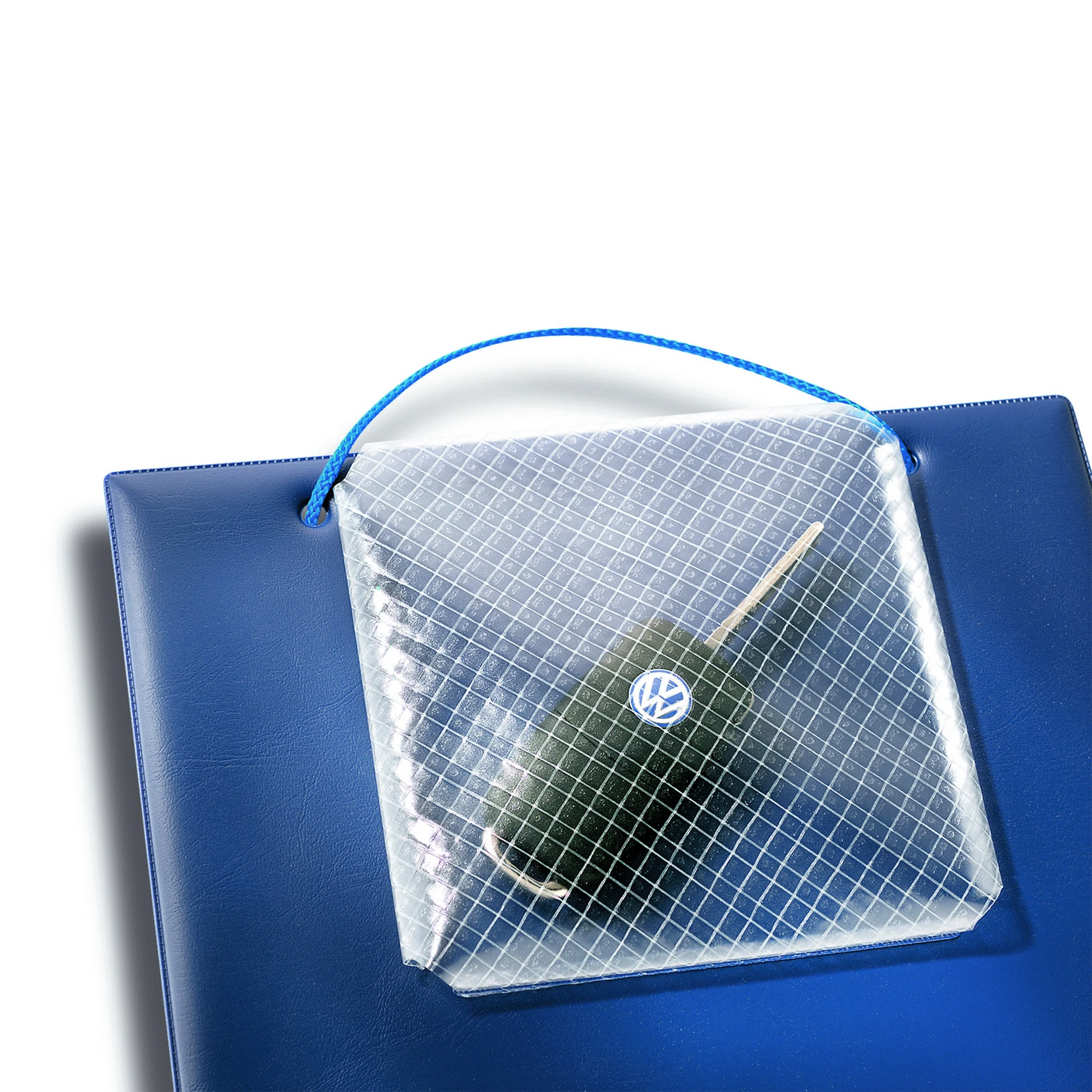 Une pochette au dos pour ranger les clés et une cordelette qui permettant de l'accrocher