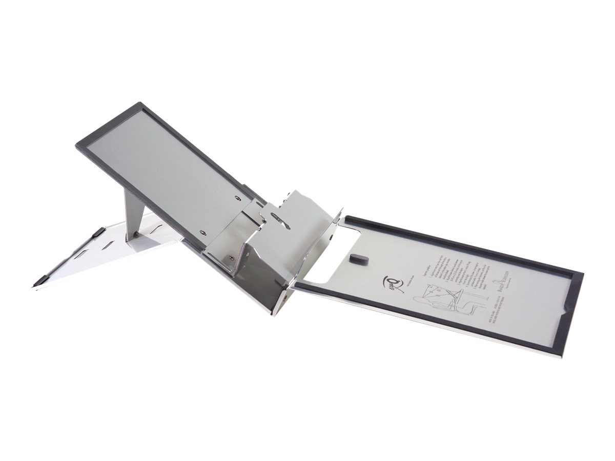 L'Ergo-Q 260 se déplie facilement et se met en place en quelques secondes. Il suffit d'insérer le connecteur rond dans l'un des cinq emplacements et de le régler à la hauteur optimale. Vous pouvez maintenant placer facilement votre ordinateur portable derrière le porte-documents intégré. Le support stable et les pieds antidérapants situés sur la face inférieure garantissent une installation de travail solide vous permettant d’utiliser votre ordinateur portable sur n'importe quelle surface.Voir la fiche produit