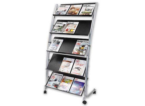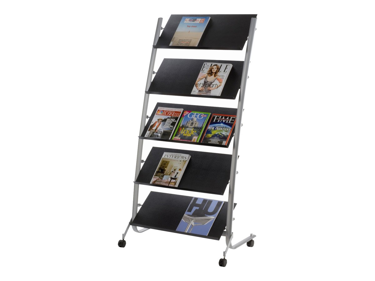 Affichez vos revues à l'accueil. Élégante et moderne, cette structure en métal et tablettes en ABS est équipée de 4 roulettes pivotantes. Capacité : 15 documents format 24 x 32 cm. Livré à plat, montage facile. Assorti au présentoir bas alu réf. 284 165. Dim. : L 87 x P 58 x H 165 cm.