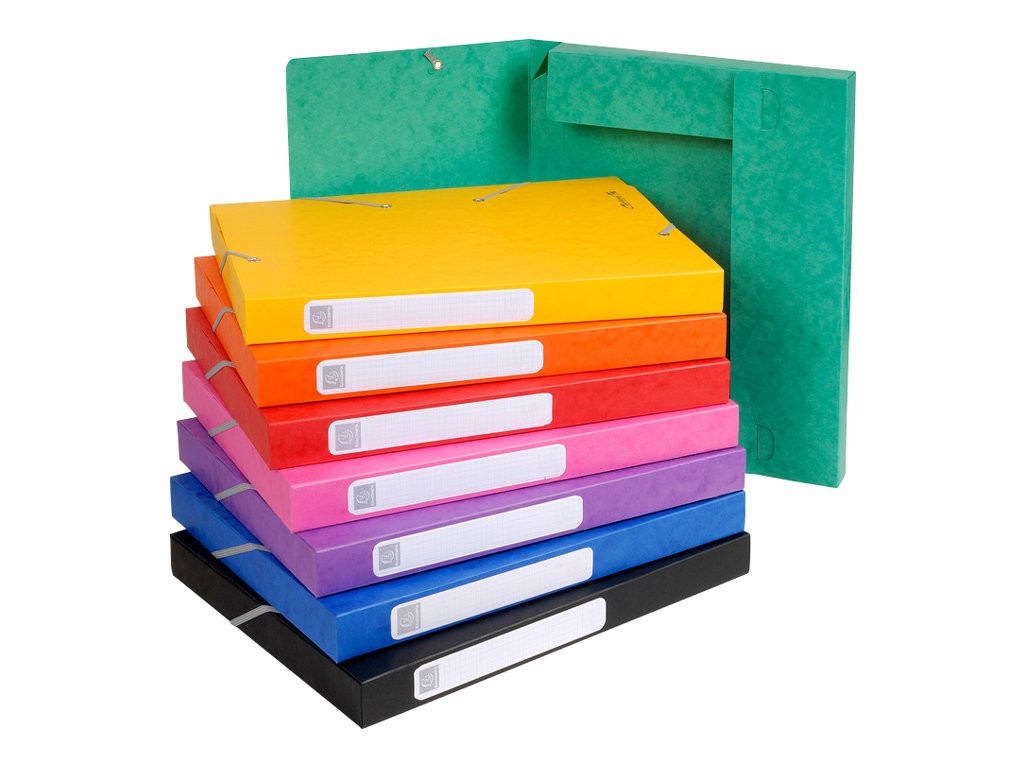 Lot de 25 boîtes. Carte lustrée 5/10ème. Fermeture par élastique. Etiquette d'indexation au dos. Livrée à plat : facilité de stockage. Pour documents 24 x 32 cm. Dos : 2,5 cm. Coloris assortis : noir, bleu, rouge, vert, orange, cerise, violet, jaune, citron, gris, ivoire, turquoise rose, tabac, violine.