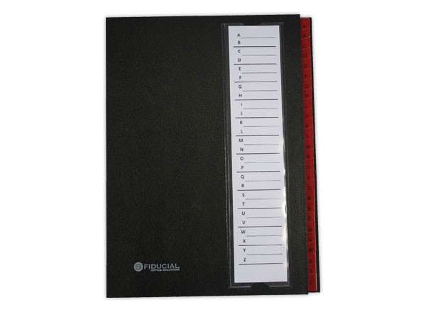 Couverture rigide Balacron. Porte étiquette et étiquettes imprimée. Fermeture par élastique. Dos extensible. 26 compartiments, une touche par lettre de l'alphabet. Touches alphabétiques plastifiées. Intérieur carte 250g grise. Format 24 x 32 cm.