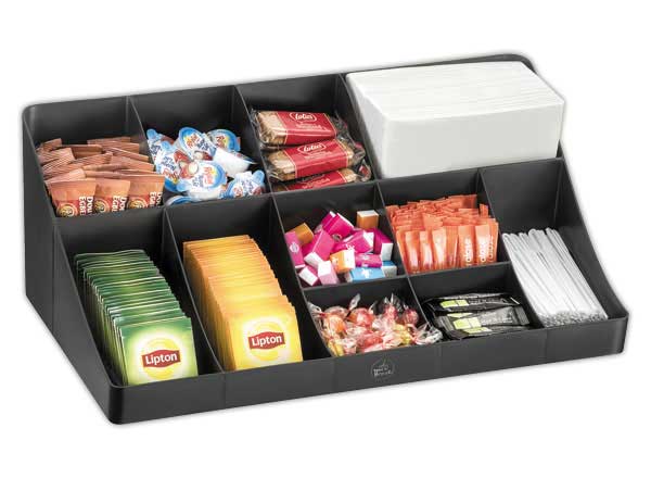 Station compartimentée en polystyrène. 11 compartiments pour ranger les produits et accessoires des pauses : serviettes, gobelets, cuillères, sucre, sachets de thé, etc... Peut contenir plus de 300 gobelets. Dim : L 46,2 x l 16,8 x H 24,9 cm.