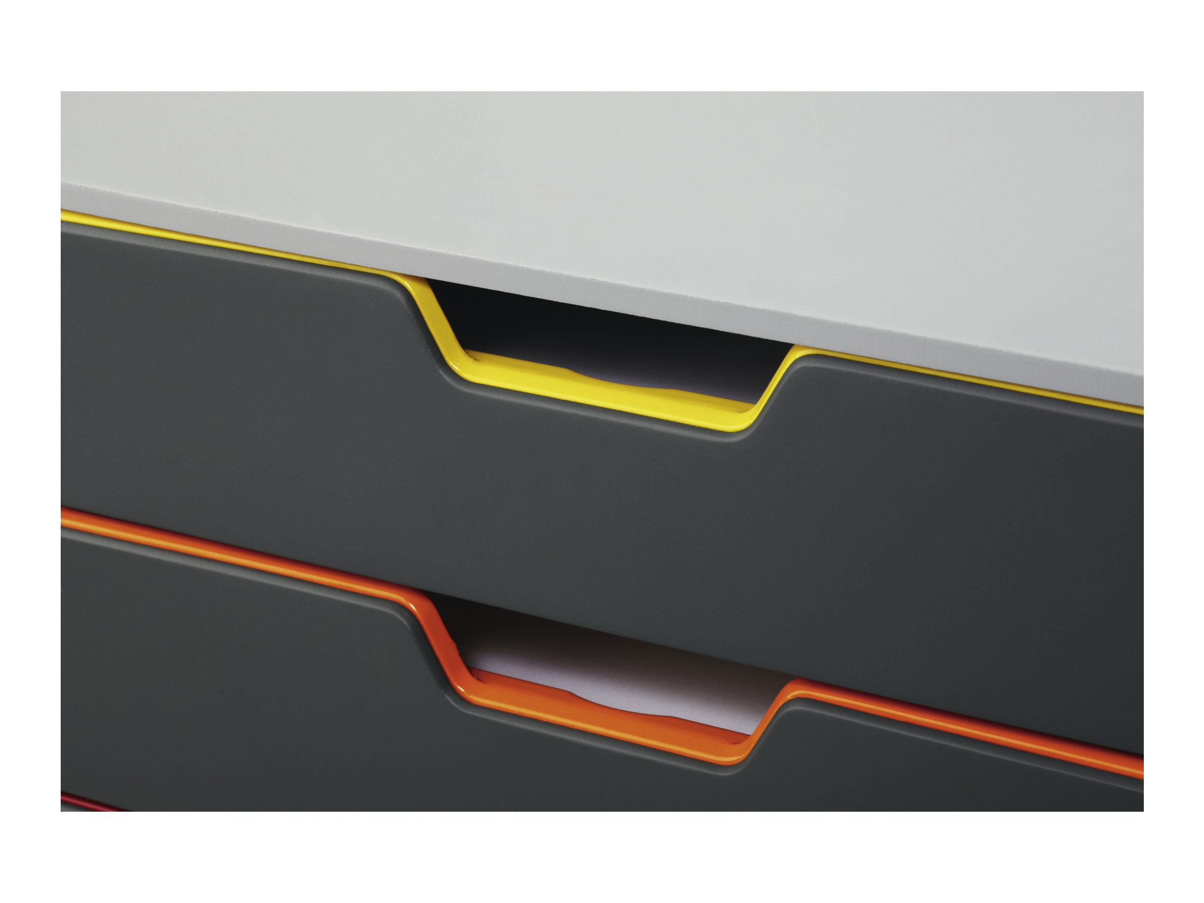 Module en ABS, équipé d'une serrure pour fermé le premier tiroir. Liserés sur les tiroirs coulissants de différentes couleurs, visibles même fermés. Deux hauteurs de tiroirs différentes ( : 7,7 et 4,8 cm). Tiroirs munis de butées d'arrêt Module superposable et juxtaposable. Livré avec porte-étiquettes et patins anti-dérapant. Accepte les documents jusqu'au format A4+. Hauteur tiroir : 5,5 cm. Dim : L 29,2 x P 35,6 x H 28 cm.