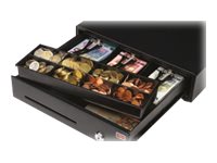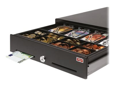 Tiroir caisse double fente en façade - 5 compartiments à pince + 8 compartiments pour pièces (amovible) - Dimensions 410 x 415 x 100 mm - connexion à imprimante ticket de caisse possible avec RJ12 (câble fourni) - livré avec jeu de 2 clés.
