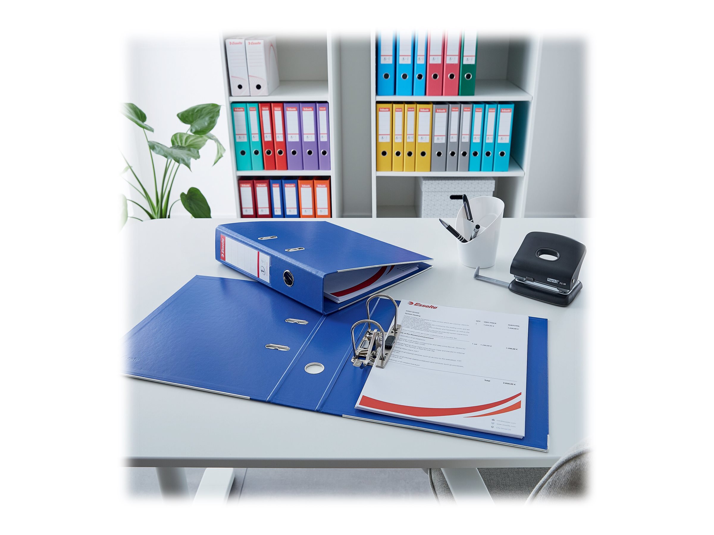 Couverture carton recouvert de polypropylène. Renforts métal. Oeillets de préhension et griffes de blocage. Mécanisme ergonomique du levier N°1Power. Coloris traditionnels: bleu foncé, jaune foncé, vert foncé, violet. Dos 7,5 cm, capacité 500 feuilles. Pour feuilles 21 x 29,7 cm.