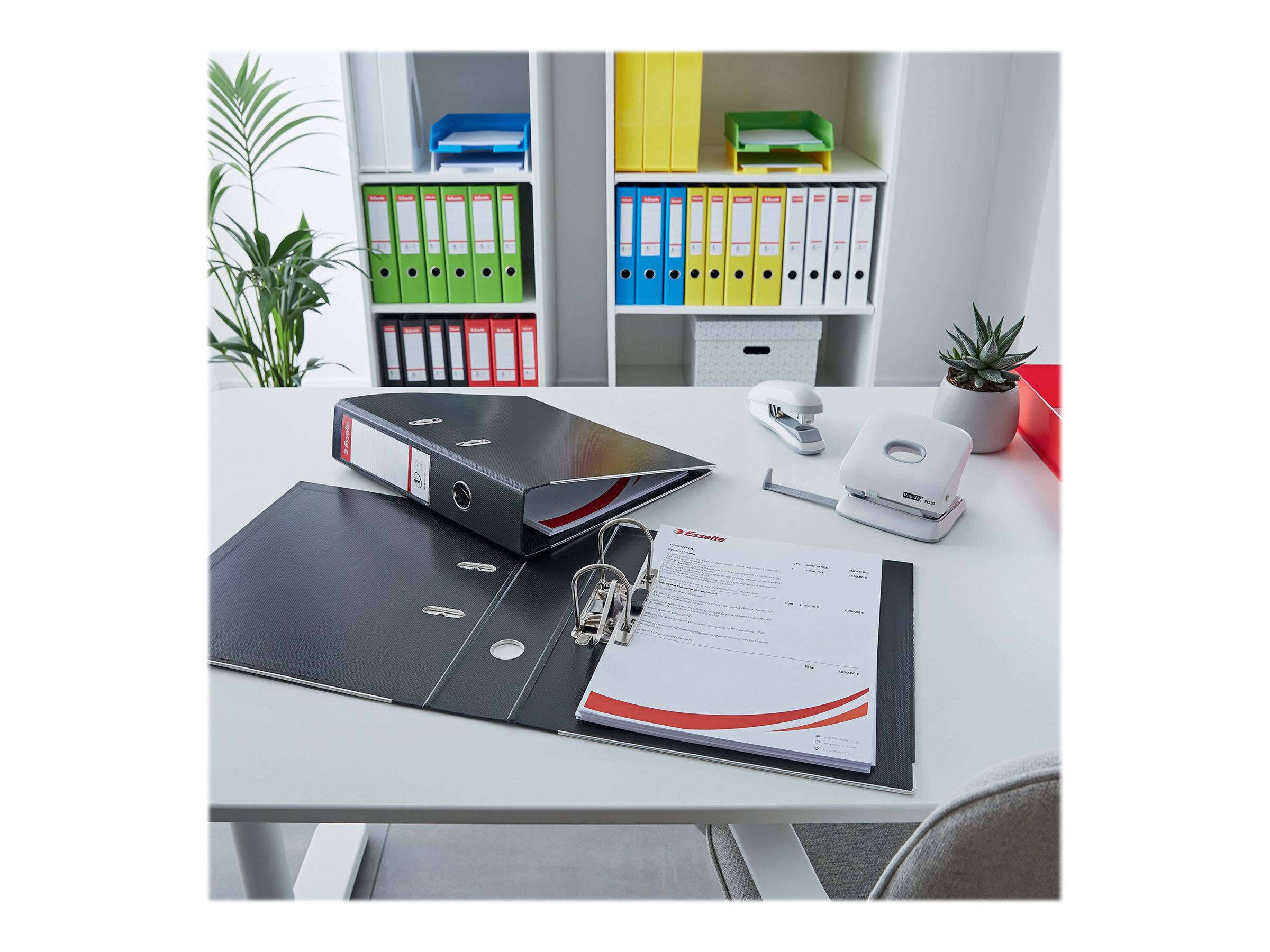Couverture carton recouvert de polypropylène. Renforts métal. Oeillets de préhension et griffes de blocage. Mécanisme ergonomique du levier N°1Power. Coloris Vivida: bleu clair, blanc, gris, noir, rouge. Dos 5 cm, capacité 300feuilles. Pour feuilles 21 x 29,7 cm.