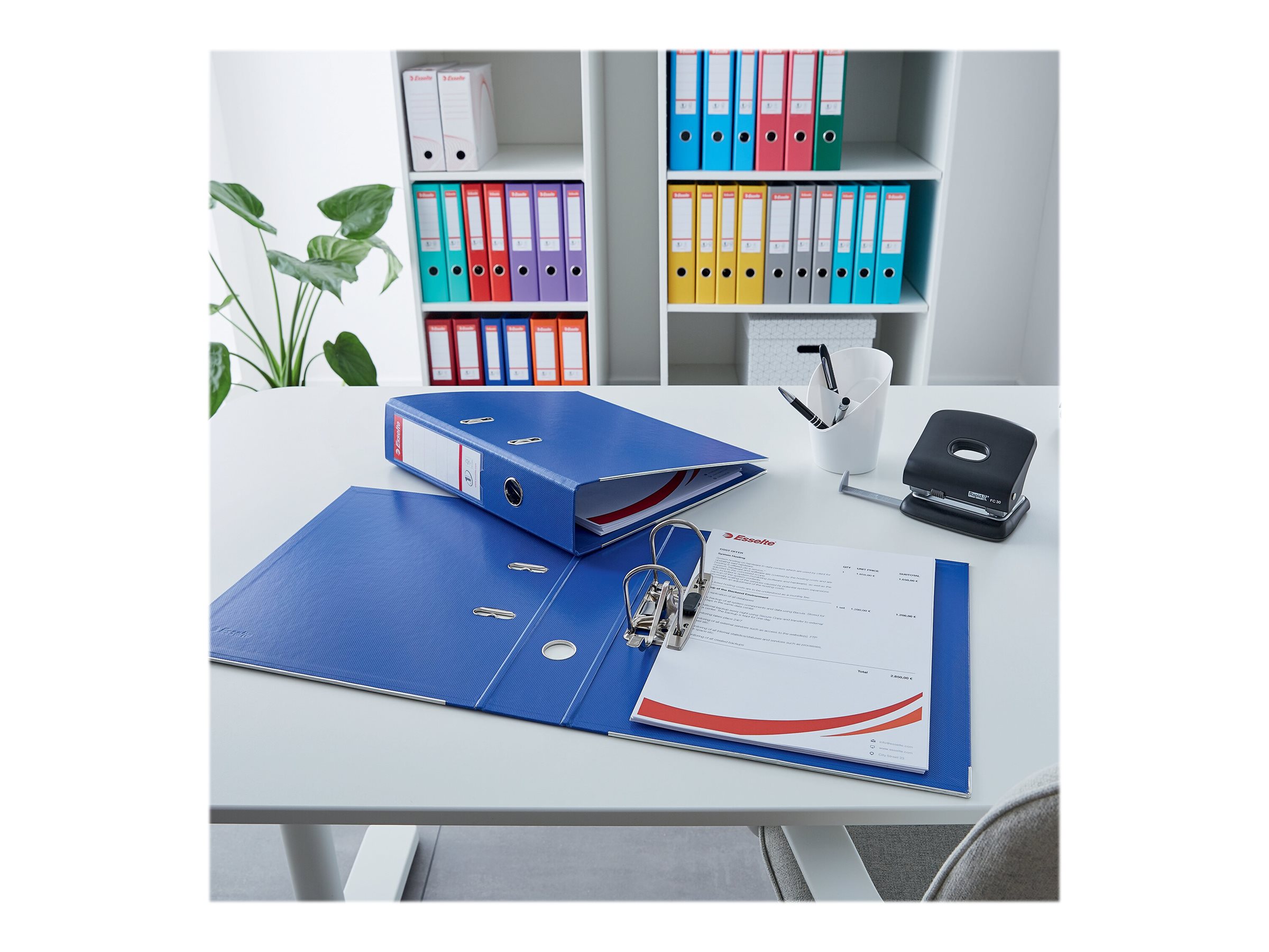 Couverture carton recouvert de polypropylène. Renforts métal. Oeillets de préhension et griffes de blocage. Mécanisme ergonomique du levier N°1Power. Coloris Vivida: bleu clair, blanc, gris, noir, rouge. Dos 5 cm, capacité 300feuilles. Pour feuilles 21 x 29,7 cm.