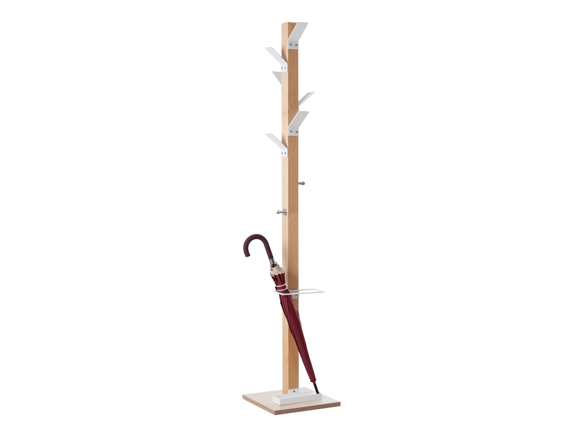 Portemanteaux en bois massif vernis équipé de 6 patères en polystyrène et 2 patères en métal pour sacs et porte-parapluies d'une capacité de 6 parapluies et coupelle de récupération d'eau. Socle en contreplaqué vernis 35 x 35 cm. Fut 6 x 6 cm. Hauteur : 1,80 m.