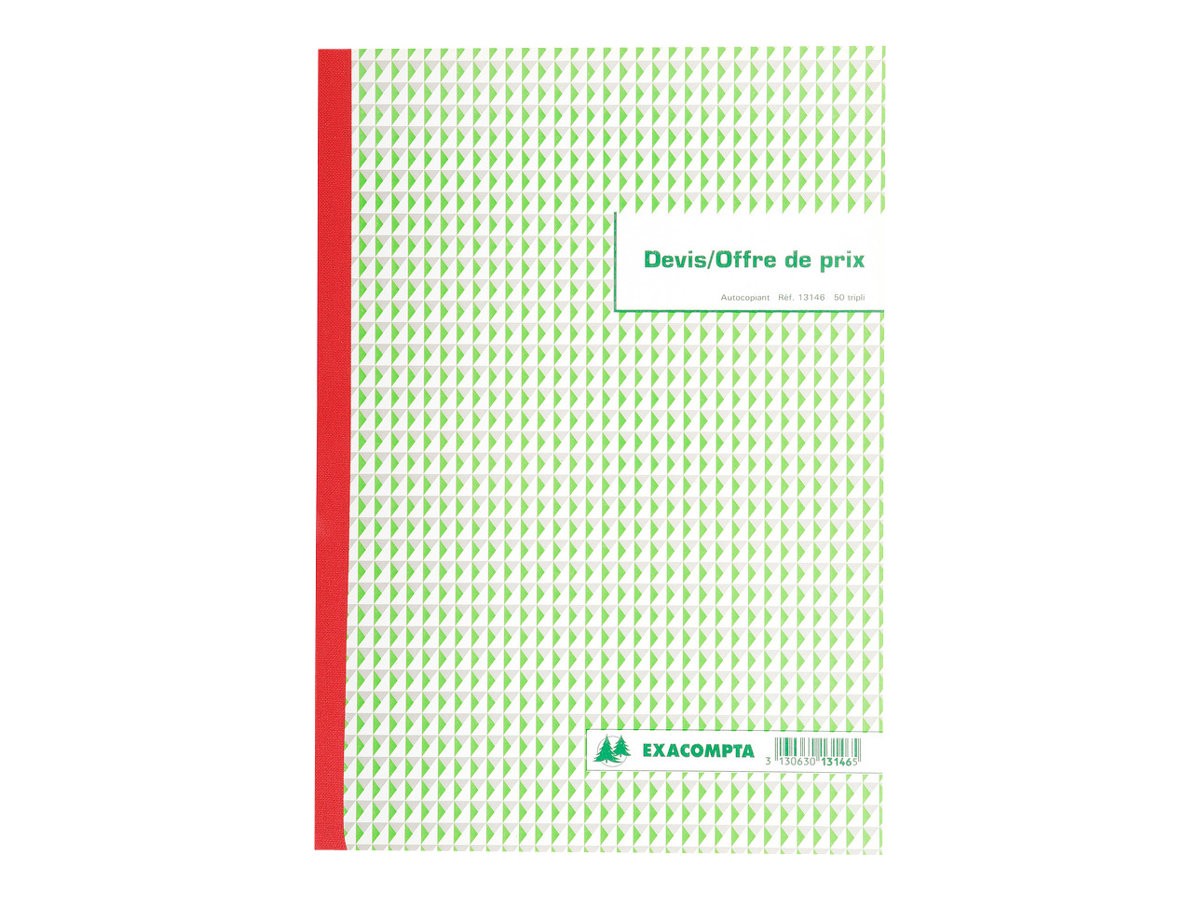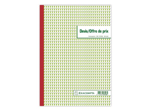 Papier autocopiant de bonne qualité, sans carbone. Présentation sous forme de registre. 50 feuillets préimprimés et numérotés. Désignation : Devis. Format : 29,7 x 21,0 cm. Foliotage : 50/3. Référence Exacompta : 13146E.