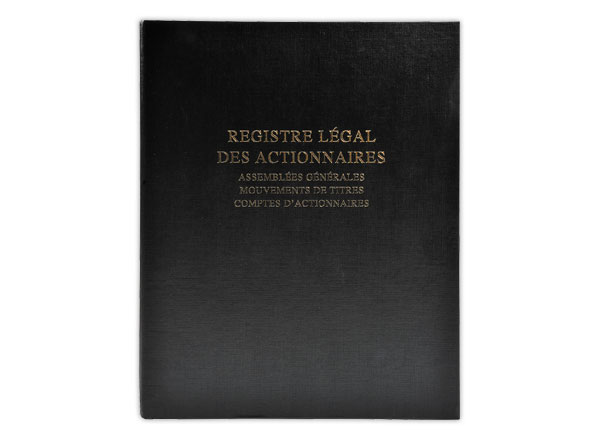 Classeur noir avec 4 anneaux. Impression du titre en doré sur la couverture et le dos. Livré avec une recharge de feuillets se composant comme suit : Livré avec 108 feuillets se composant comme suit : - 50 feuillets numérotés de 1 à 50 pour les Assemblées générales. - 23 feuillets numérotés pour les Mouvements des Titres. - 10 Tables numériques pour répertorier les numéros des comptes des Actionnaires. - 25 Fiches individuelles des comptes des Actionnaires. Dimensions de la reliure : 265 x 320 mm. Largeur du dos : 40 mm. Dimensions des feuillets : 210 x 297 mm - A4.