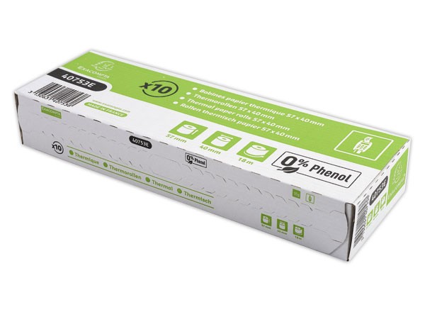 Pour terminaux cartes bancaires. Laize x longueur : 57 mm x 18 m (+/-2m). Ø Extérieur: 40 mm. Ø Mandrin :12 mm. Qualité papier : 1 pli thermique 55 g/m² sans aucun phénol.