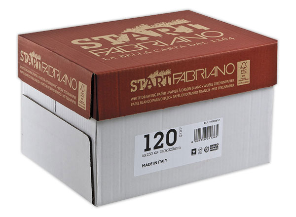 Paquet de 250 feuilles de papier dessin blanc. Fabriqué sans acide avec énergie hydraulique. Résistant au gommage et au grattage.