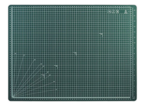 Plaque de coupe A2 multi fonction composée de 3 couches de texture différentes : 2 couches externes en TPE et une couche interne rigide en PP. Surface auto-cicatrisante de haute qualité : La lame s'insère à l'intérieur du caoutchouc qui se referme sans laisser la moindre trace. Face quadrillée 5x5 cm + angles de coupe pour les travaux de découpe précis. Non toxique - sans DEHP. Coloris: Vert.