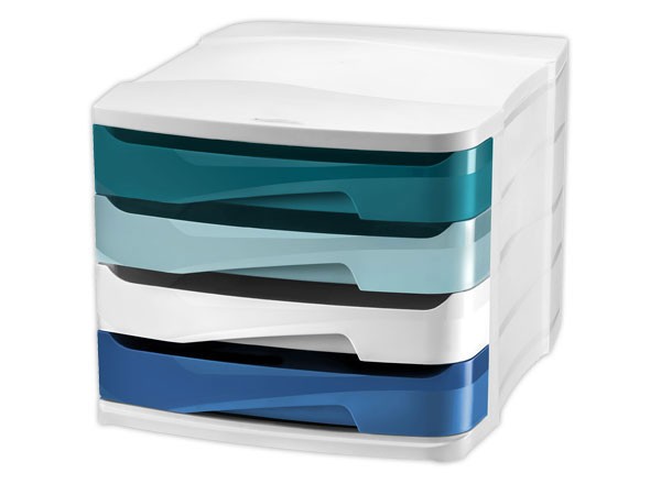 Des couleurs tendance et des tiroirs caractérisés par une façade asymétrique brillante. Les 4 tiroirs acceptent tous les formats jusqu'au 24 x 32 cm et les chemises à élastique. Équipés d'une butée d'arrêt, ils peuvent contenir jusqu'à 450 feuilles. Hauteur tiroir : 4,4 cm. En polystyrène antichoc 100 % recyclable. Dimensions : L 29,2 x P 38,6 x H 24,6 cm.