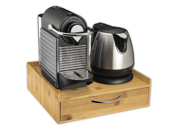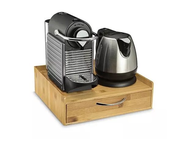 Support pour cafetière, idéal pour optimiser l'espace. Il convient aussi bien à la maison que dans un environnement bureau. Tiroir coulissant avec 6 séparations pour une organisation optimale de vos dosettes de café. 100% Recyclable (hors poignée en métal) avec un vernis protecteur imperméabilisant le produit. Peut contenir 50 dosettes Nespresso ou 35 Special T. Dim. : L 30,50 x P 32,7 x H 9,80 cm. Largeur des sections : 2,54 cm. Supporte 10Kg de charge.