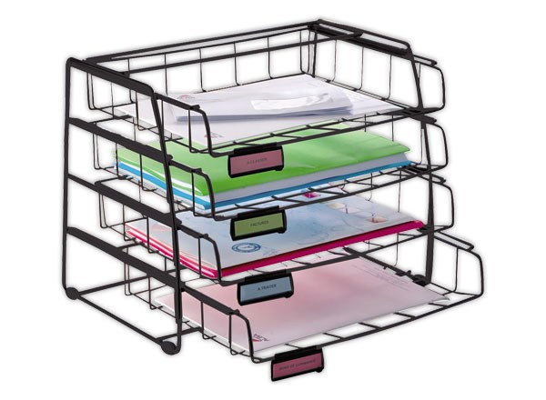 Set de 4 corbeilles coulissantes en fil métal noir muni de portes-étiquettes amovibles en plastique noir - Chargement latéral jusqu'au format 24 x 32 cm (Orientation Paysage) - Patins antidérapants pour une grande stabilité - Dim. : L 39 x P 30 x H 31,5 cm. Hauteur tiroir : 6,5 cm.