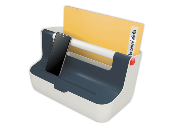 Bac de rangement mobile légère et facile à transporter grâce à sa solide poignée renforcée en aluminium. Couvercle masquant le contenu pour une apparence soignée et plus de confidentialité. Large compartiment à l'arrière pour les documents format A4. Equipé d'un rebord pour positionner votre smartphone/tablette. Fabriqué en ABS durable et résistant. Dim. : L 38,7 x P 31,4 x H 19,6 cm.