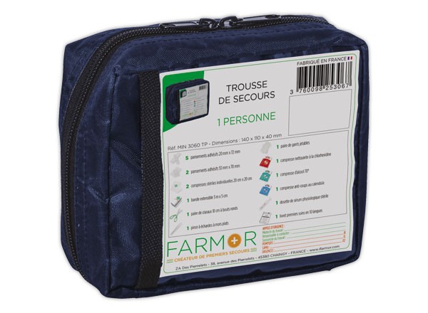 5 pansements adhésifs 2 x 7 cm. 2 pansements adhésifs 5 x 7 cm. 2 compresses stériles individuelles 2 x 2 cm. 1 bande extensible de 3 m x 5 cm. 1 paire de ciseaux 10 cm à bouts ronds. 1 pince à échardes à mors plats. 1 paire de gants jetables. 1 compresse nettoyante à la chlorhexidine. 1 compresse d'alcool à 70°. 1 compresse anti coups au calendula. 1 dosette de sérum physiologique stérile. 1 livret premiers soins en 10 langues.