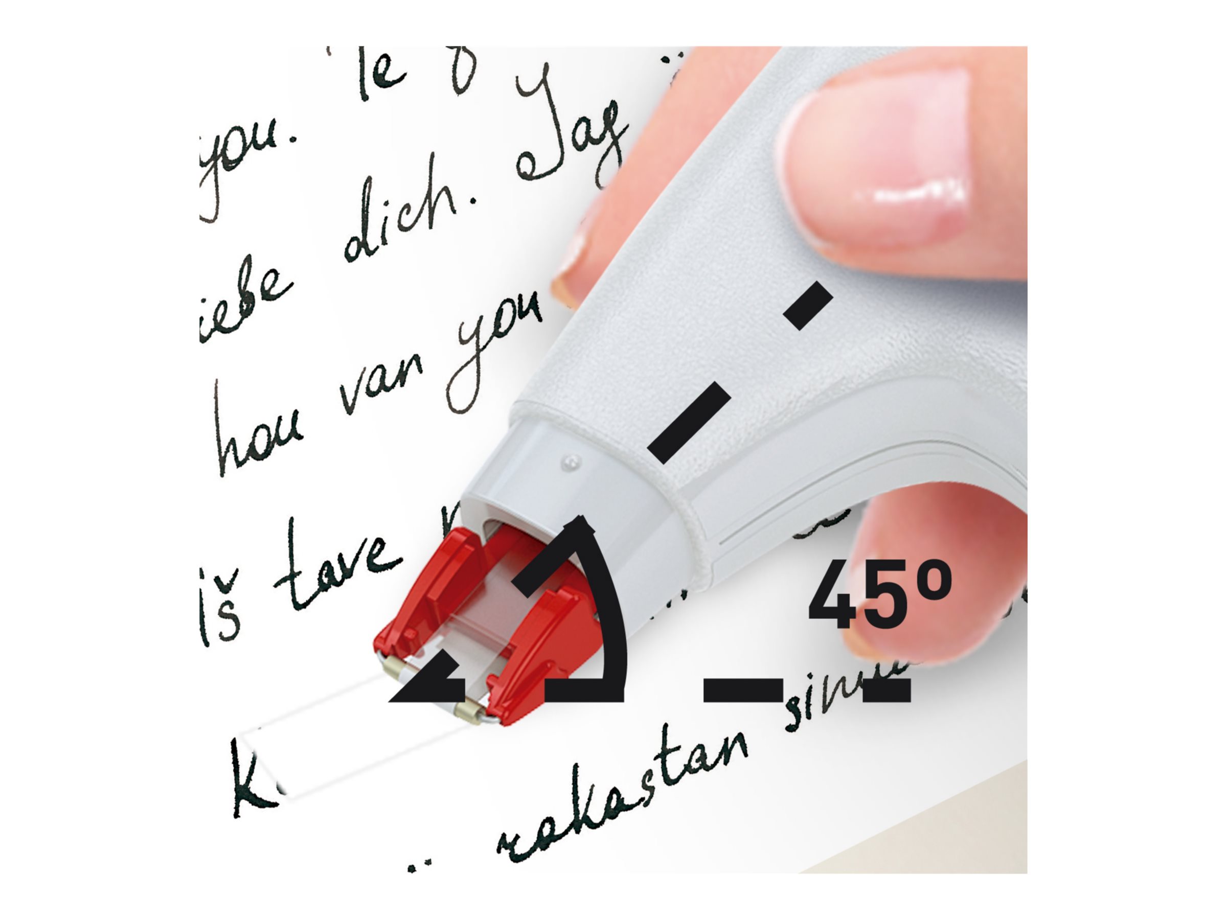- Correction sèche. - Utilisation latérale. - Ergonomique : se tient comme un stylo Double sens : "Pull" pour une phrase entière, "Push" pour une lettre uniquement. - Longueur de bande : 10 m. - Largeur de bande : 4,2 mm. - Protection de l'embout par capuchon.