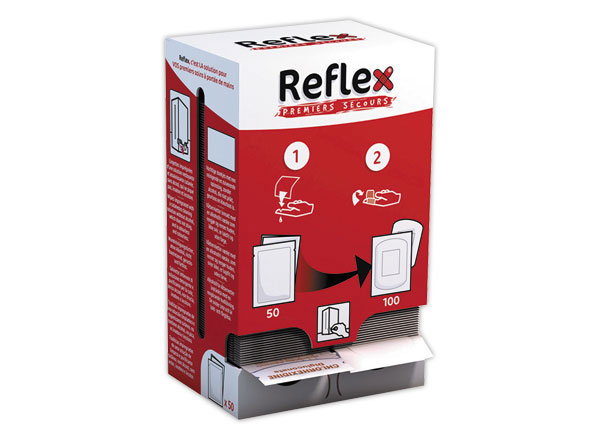 Ensemble de secours REFLEX en carton FSC 100% recyclable, 50 lingettes nettoyantes + 100 pansements adhésifs, fixation murale amovible au moyen de pastilles auto agrippantes.