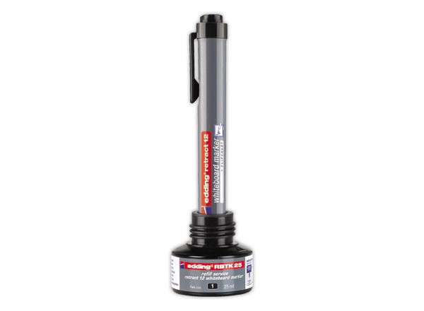 Flacon de recharge d'encre pour recharger les marqueurs pour tableaux blancs réf. 143585. Contenance de 25 ml. Laisser simplement le marqueur, pointe vers le bas, dans le flacon de recharge pendant au moins une heure, dans l'idéal toute une nuit. Encre sans xylène, sans toluène, sans addition d'acétate de butyle.
