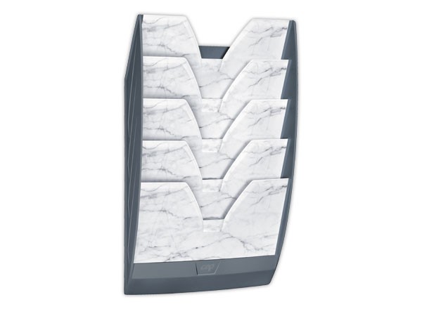 Présentoir mural composé d'un ensemble monobloc très robuste et de 5 cloisons imprimées d'un motif Marbre Gris sobre et élégant pour une ambiance minimaliste et intemporelle, en ligne avec les tendances de décoration d¿intérieur. Large ouverture en « V » permettant une excellente préhension des documents, même de petite taille. Accepte des documents épais jusqu'au format 24 x 32 cm, rangés horizontalement ou verticalement. Dim. utiles d'un compartiment : 325 x 26,5 mm. Possibilité de superposer et juxtaposer plusieurs présentoirs. Kit de fixation fourni. L'ensemble supporte jusqu'à 7 kg. PS résistant, 55% recyclé*, 100% recyclable. Impression à partir d'encres sans solvant 100% recyclables. Dim. L 35 x P 12 H 58 cm.