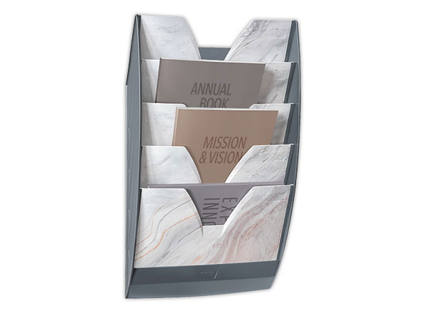 Présentoir mural composé d'un ensemble monobloc très robuste et de 5 cloisons imprimées d'un motif Marbre Rose sobre et élégant pour une ambiance minimaliste et intemporelle, en ligne avec les tendances de décoration d¿intérieur. Large ouverture en « V » permettant une excellente préhension des documents, même de petite taille. Accepte des documents épais jusqu'au format 24 x 32 cm, rangés horizontalement ou verticalement. Dim. utiles d'un compartiment : 325 x 26,5 mm. Possibilité de superposer et juxtaposer plusieurs présentoirs. Kit de fixation fourni. L'ensemble supporte jusqu'à 7 kg. PS résistant, 55% recyclé*, 100% recyclable. Impression à partir d'encres sans solvant 100% recyclables. Dim. L 35 x P 12 H 58 cm.