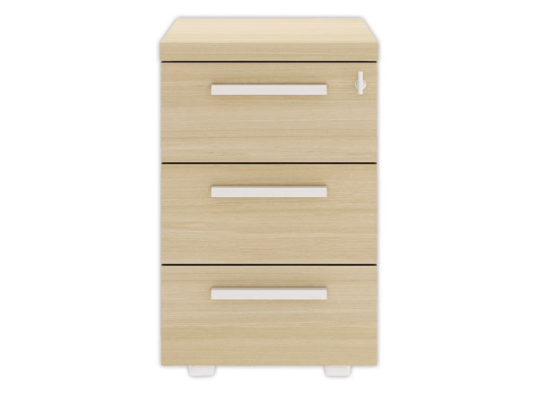Caisson 3 tiroirs mobile. - Mélaminé dessus épaisseur 35 mm, côtés et face tiroirs - épaisseur 25 mm. - Décor chêne structuré - Chants ABS même décor. - Poignées blanches de 22 cm de longueur. - Verrouillage centralisée des 3 tiroirs, 1 serrure verrouillage simple. Livré avec 2 clés. Tiroirs sur coulisses à galet, équipés de freins amortisseurs. 4 Roulettes. Dim. : L 42 x P 60 x H 65 cm. Dim. intérieures des tiroirs : L 53,8 x P 8, 6 x H 33 cm. Livré monté