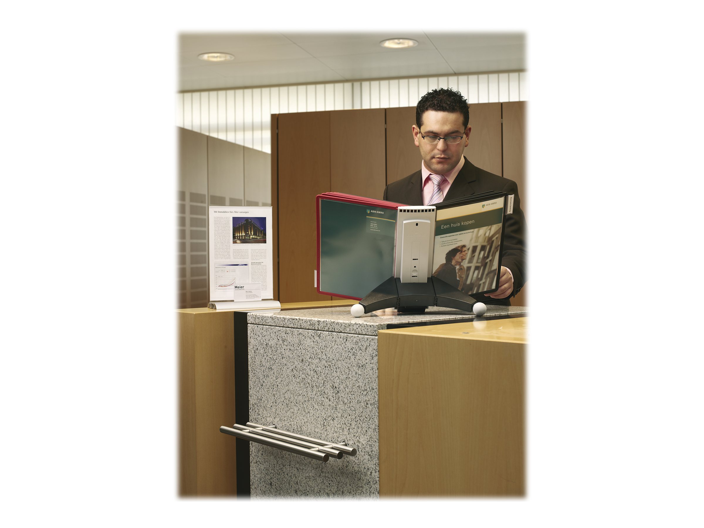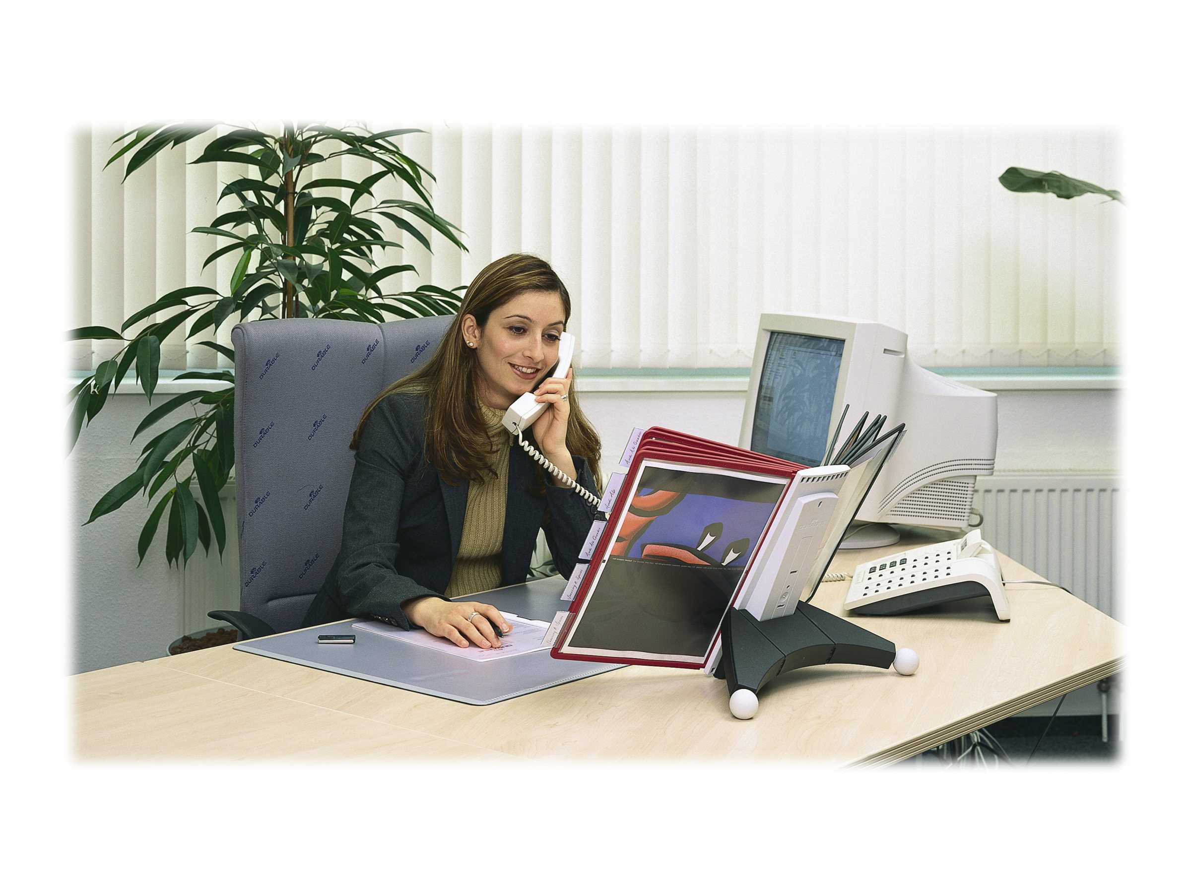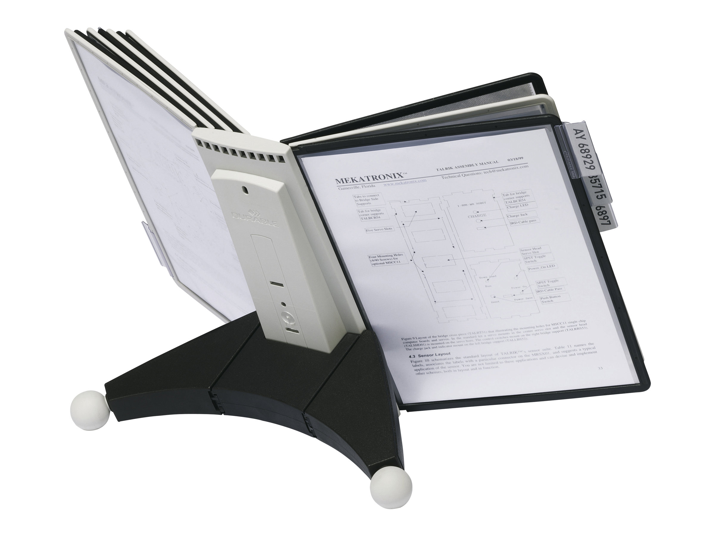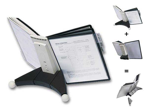 Système de consultation évolutif et design. Livré avec : 10 poches A4 (5 noires, 5 grises) en polypropylène traité antireflet. 10 onglets d'indexation. Base lestée et patins antidérapants. Extension Jusqu'à 100 poches, par simple ajout de modules d'extension. Dimension ouvert : 52 cm. Dimension fermé : 44 cm. Hauteur : 28,5 cm.
