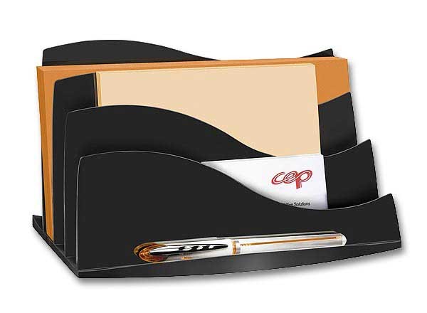 Idéal pour trier et rassembler tout le nécessaire à courrier. 3 compartiments inclinés, de hauteur progressive, offrent une parfaite visualisation du contenu et facilitent la préhension. Parfaite stabilité assurée par le socle débordant. Capacité : 75 enveloppes + 1 case glissière à l'avant permettant de stocker cartes de visite ou instrument d'écriture. Polystyrène anti-choc + 90% recyclé, 100% recyclable. Dim. : L 22,5 x P 13 x H 13 cm.