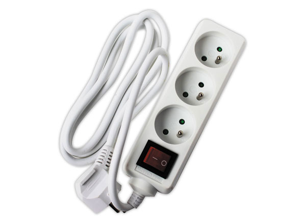 Prise de terre normalisée 10/16 A. NF avec éclipses de sécurité. 3 prises - câble 1,5 m avec interrupteur.