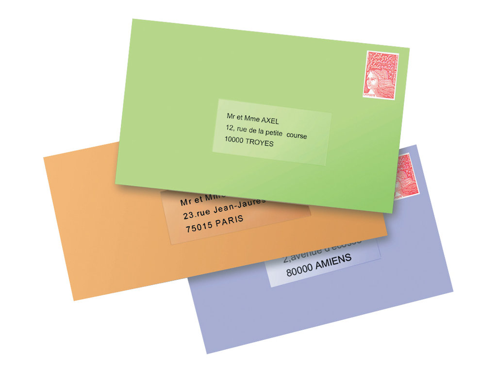 - Les étiquettes transparentes se fondent avec la couleur de l'enveloppe, le texte paraît imprimé directement dessus