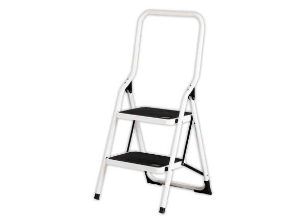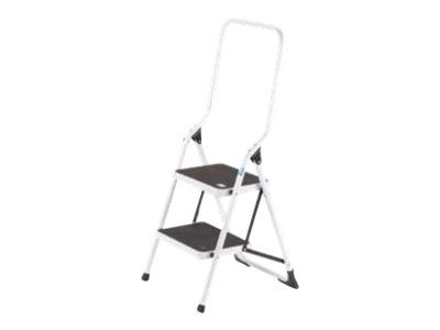 Montants en tube d'acier laqué époxy blanc. Marches larges antidérapantes. L'escabeau se plie facilement (ép. : 3,5 cm), il se glisse aisément derrière une porte. Certifié TUV. 2 marches, poids 4,2 kg Dimensions : L 48 x P 35 x H 88 cm. Marches : L 38 x P 26 cm Hauteur des marches: 23,5 cm. Garde corps: H 50 cm.