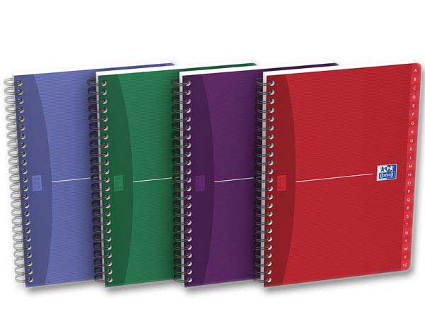 Couverture souple pelliculée. Touches alphabétiques plastifiées. Format :A5 - 14,8 x 21 cm. Réglure : Ligné 7 mm. Reliure spirale. 180 pages. Coloris assortis.