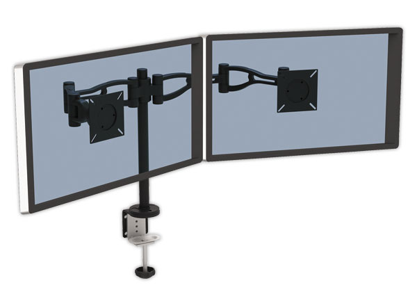 Deux écrans entièrement ajustables pour une visibilité optimale. Maximise votre confort sur un espace de travail réduit. - Facile à monter : la pince s'accroche facilement au bureau (compatible passe-câbles de >82mm). - Inclinaison haut/bas de 37°. - Pivote vers la droite ou la gauche avec un angle de 360° - Répond aux normes de fixation VESA, supporte les écrans jusqu'à 10kg. - Recyclable à 86%. - Hauteur de 6 à 68 cm, réglable par vis de fixation. - Profondeur ajustable bras 45 cm. - Fixation au bureau : Pince de 3,0 à 7,6 cm. - Fixation écran : espacement accroche 75 x 75 et 100 x 100 mm.