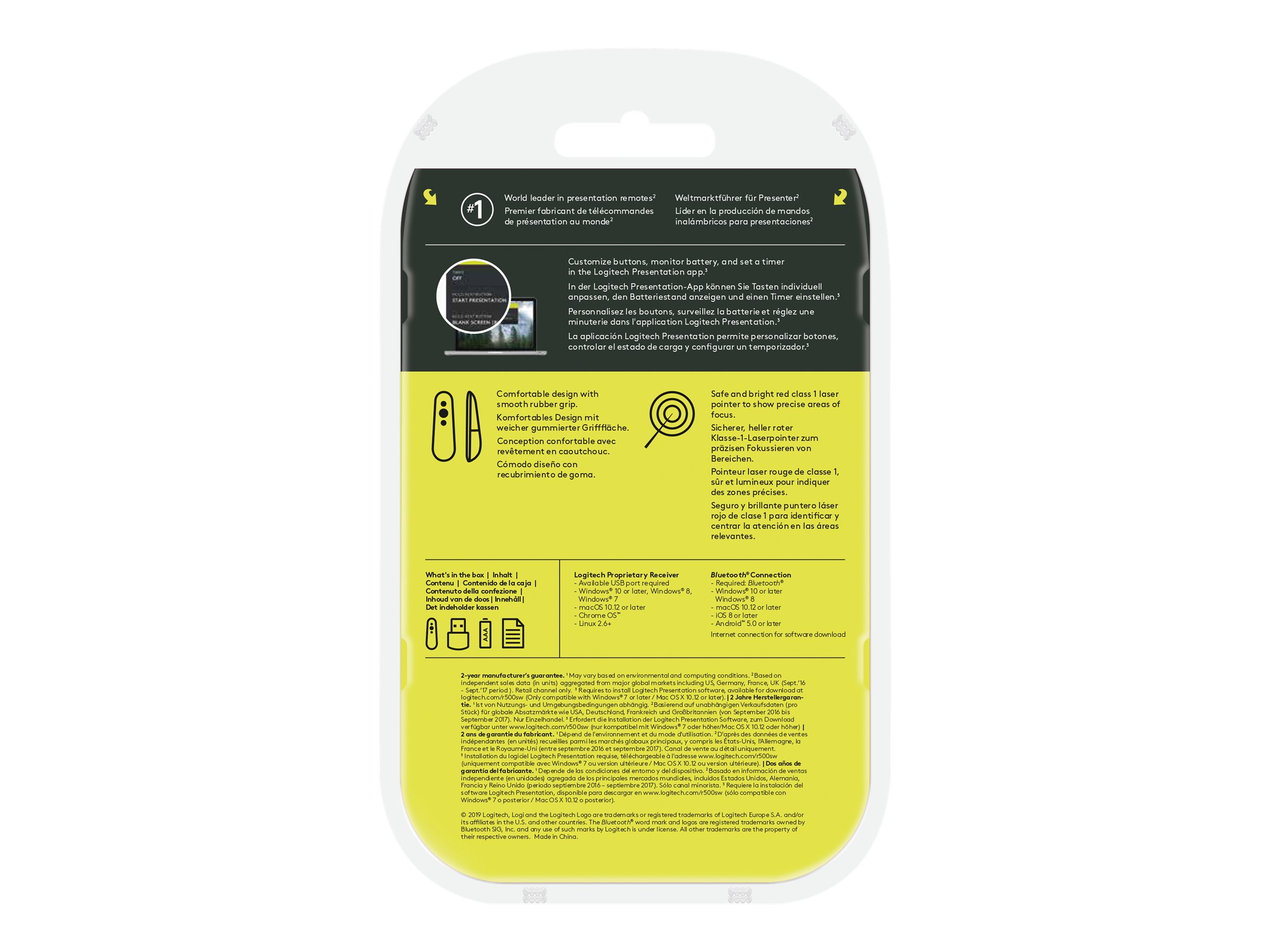 Effectuez des présentations percutantes grâce à la télécommande de présentation R500s. Déplacez-vous librement et parcourez les diapositives jusqu'à 20 mètres de distance tout en mettant en évidence les points clés grâce au pointeur laser rouge. La télécommande R500s a été optimisée pour être utilisée sous Windows , macOS et avec les principaux logiciels de présentation.