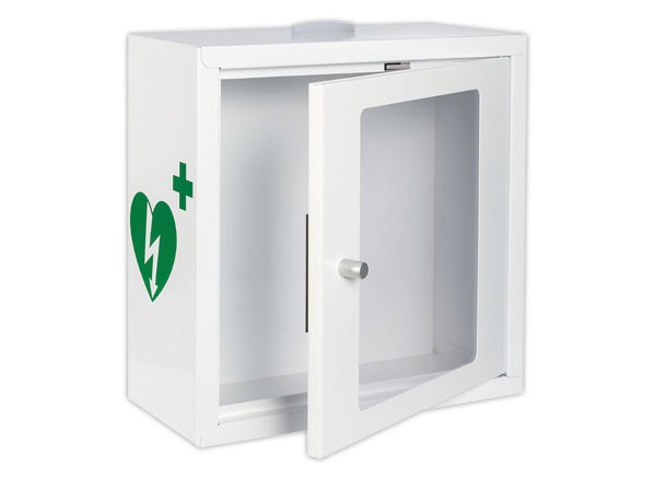 Armoire murale métallique pour défibrillateur, destiné aux espaces publics intérieurs : entreprises, salles de sports, locaux communaux... Ouverture magnétique par porte vitrée. - Déclenchement de l'alarme (70 dB à l'ouverture de la porte). - Arrêt de l'alarme à la fermeture. - Pas besoin d'alimentation electrique. - 2 points pour fixation murale. - Dim. : 450 x 400 x 180 mm. - Poids 4 Kg.