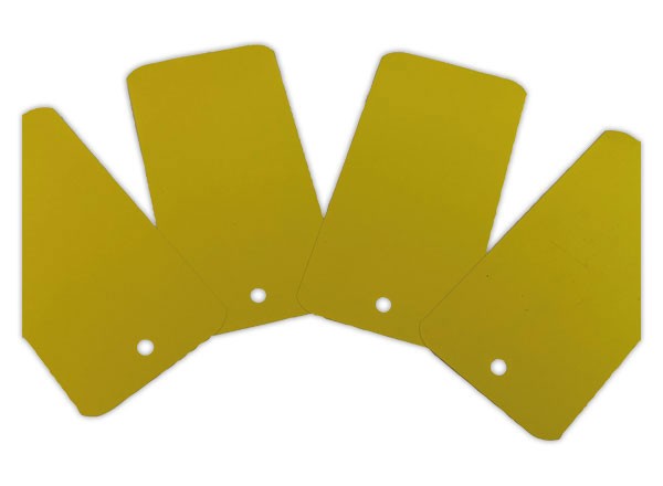 Ces étiquettes sont utilisées pour l'identification de produits pendant le process de fabrication, et pour l'expédition de produits stockés en extérieur. Elles sont dotées d'un oeillet de suspension, permettant de les fixer facilement. Epaisseur : 0,5 mm.