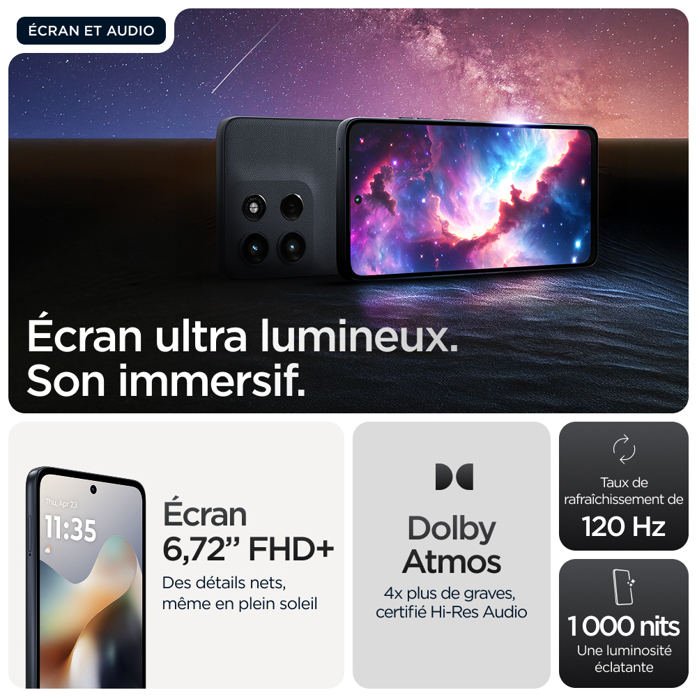 - Appareil photo de 50 MP optimisé par moto ai avec capteur Sony LYTIA™. Prenez des photos magnifiquement détaillées de jour comme de nuit, et notamment des selfies haute résolution et des clichés impressionnants en ultra-grand angle