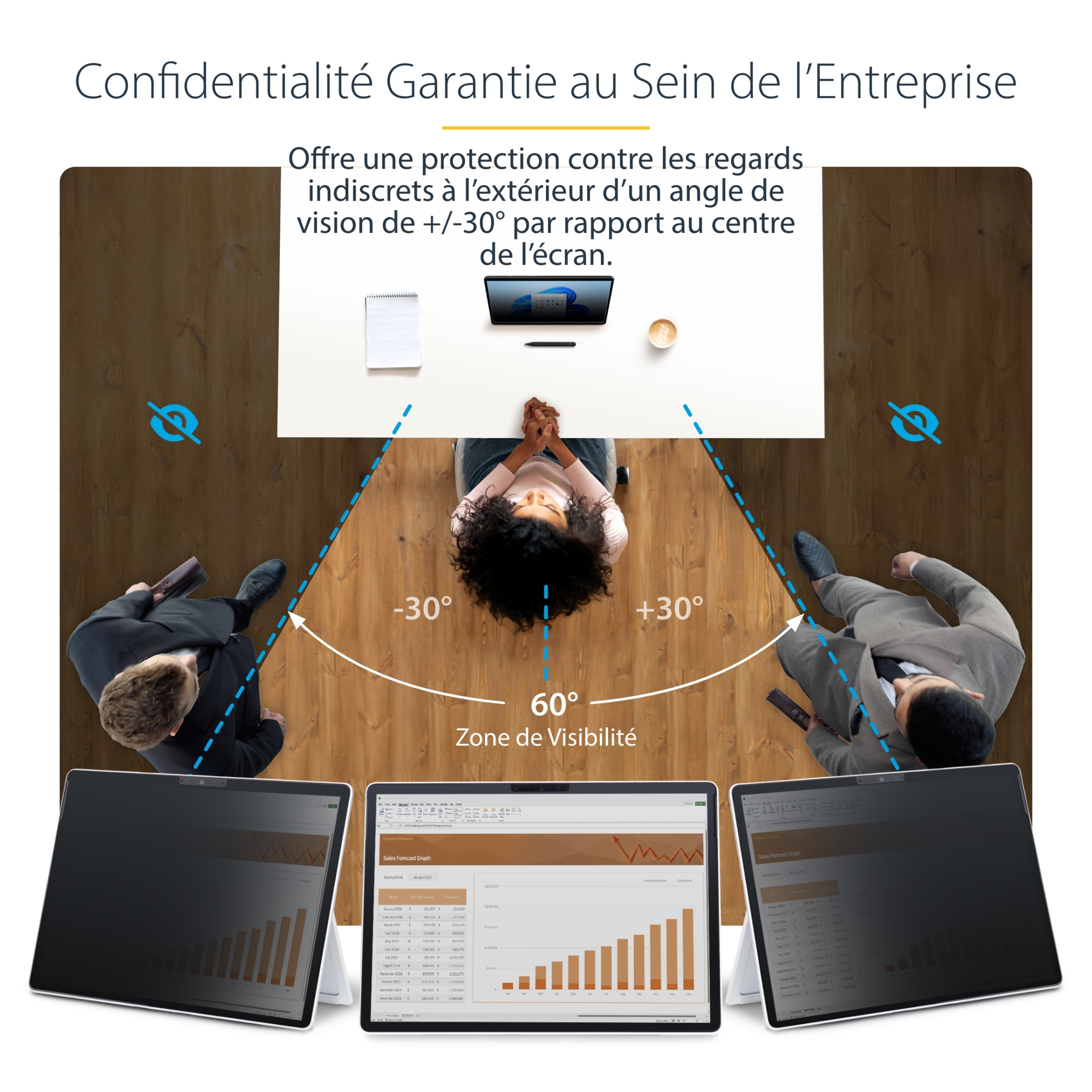 Le filtre de sécurité assure une confidentialité optimale en mode portrait ou paysage lorsqu'il est vu au-delà de 30° du centre, couvrant une zone visible totale de 60°. Il prend en charge l'entrée tactile et les gestes, préservant l'expérience interactive d'un ordinateur portable Surface Pro tout en maintenant la confidentialité du contenu à l'écran.