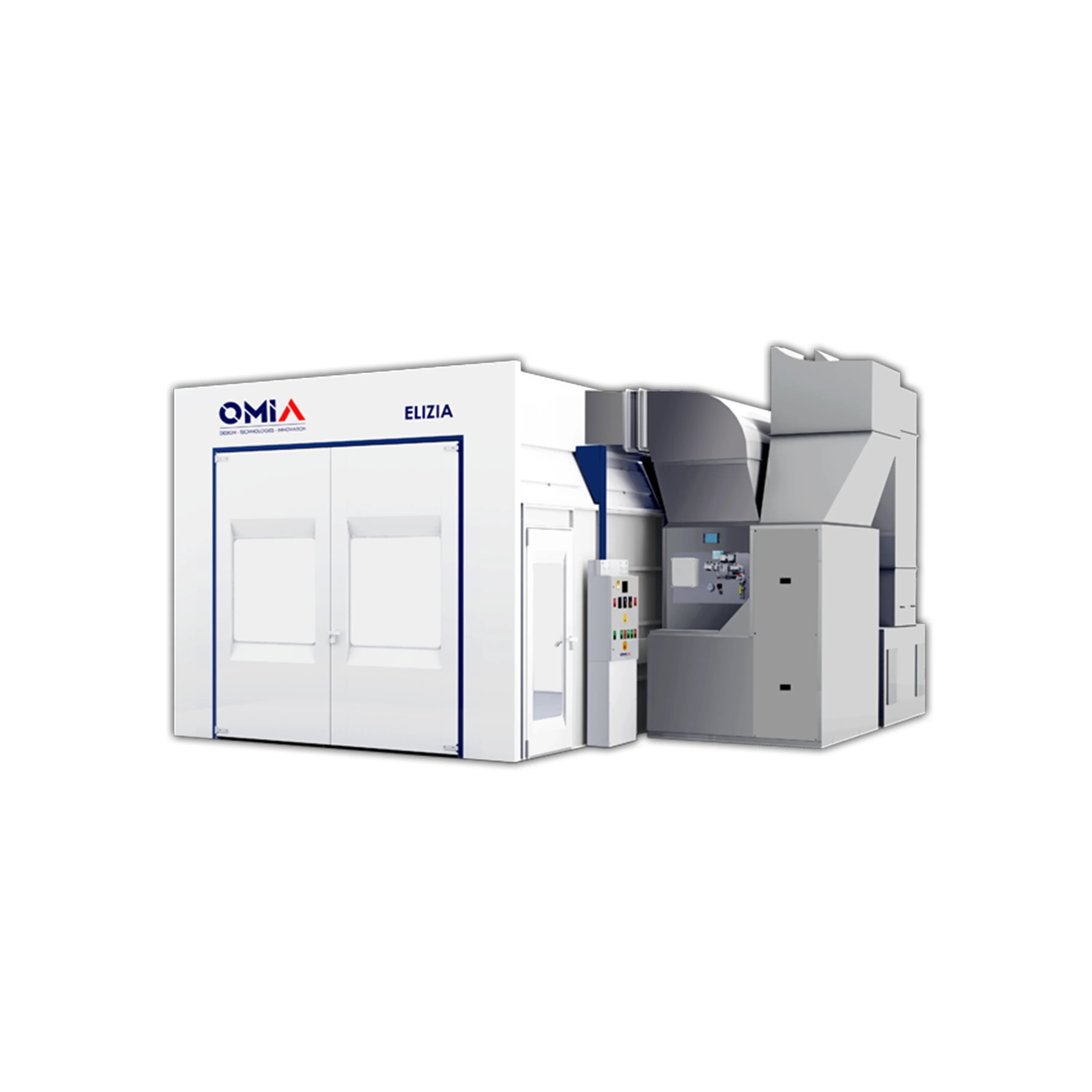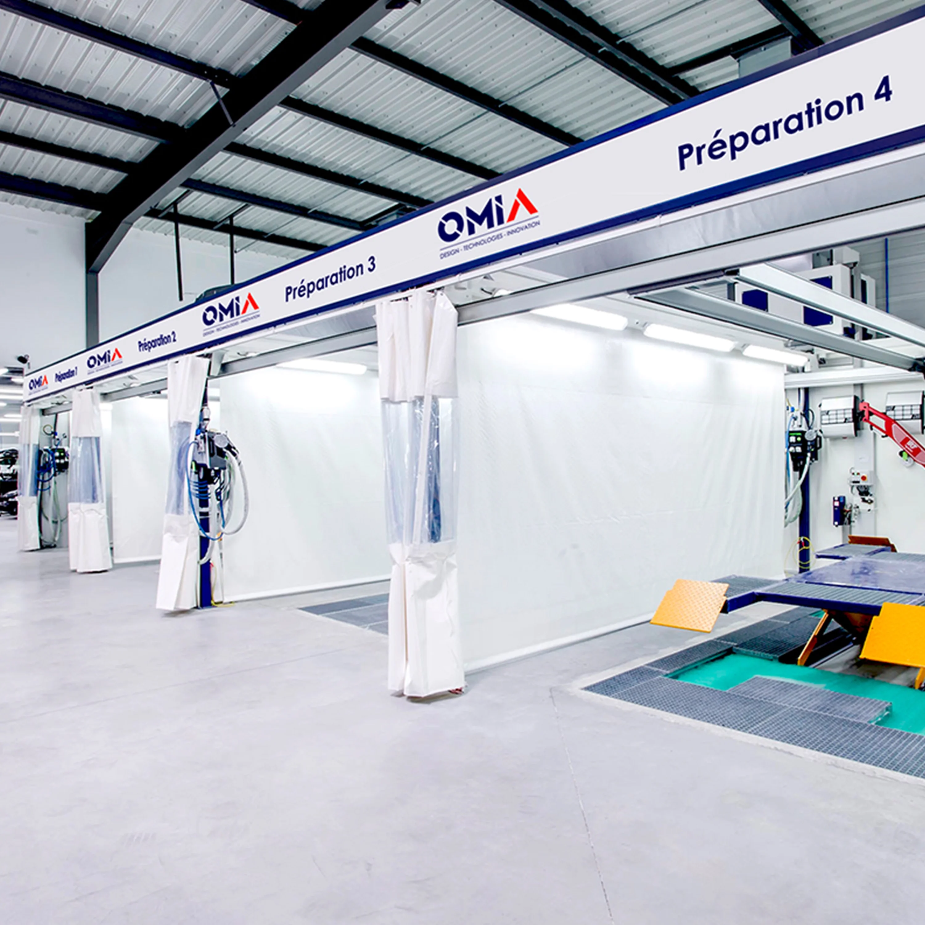 - Plusieurs options et variantes possibles : compensation d'air chaud avec ou sans plénum / concept de ponçage par aspiration centralisée avec satellites ou bornes multi-énergies / tables élévatrices prise sous coque ou prise sous roues / portique suspendu IR ou combi IR/UVA, etc…